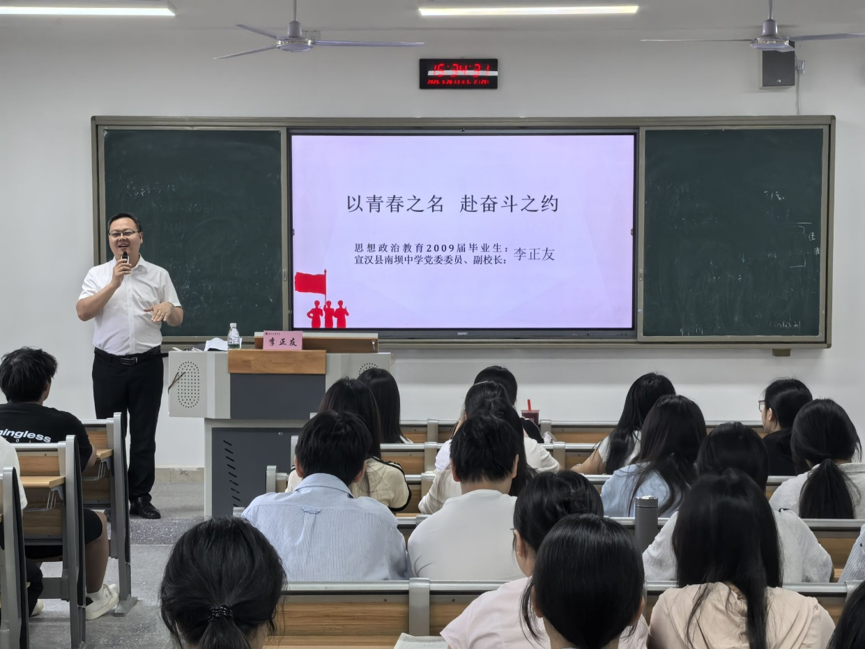 5月28日下午,优秀员工思政大讲堂系列讲座第五讲——《以青春之名,赴奋斗之约》在莲湖校区东区举行。宣汉县南坝中学副董事长、我校社科系2009届思政教育本科毕业生李正友员工担任主讲,讲座由宝盈bbin直营平台副经理何先成主持。