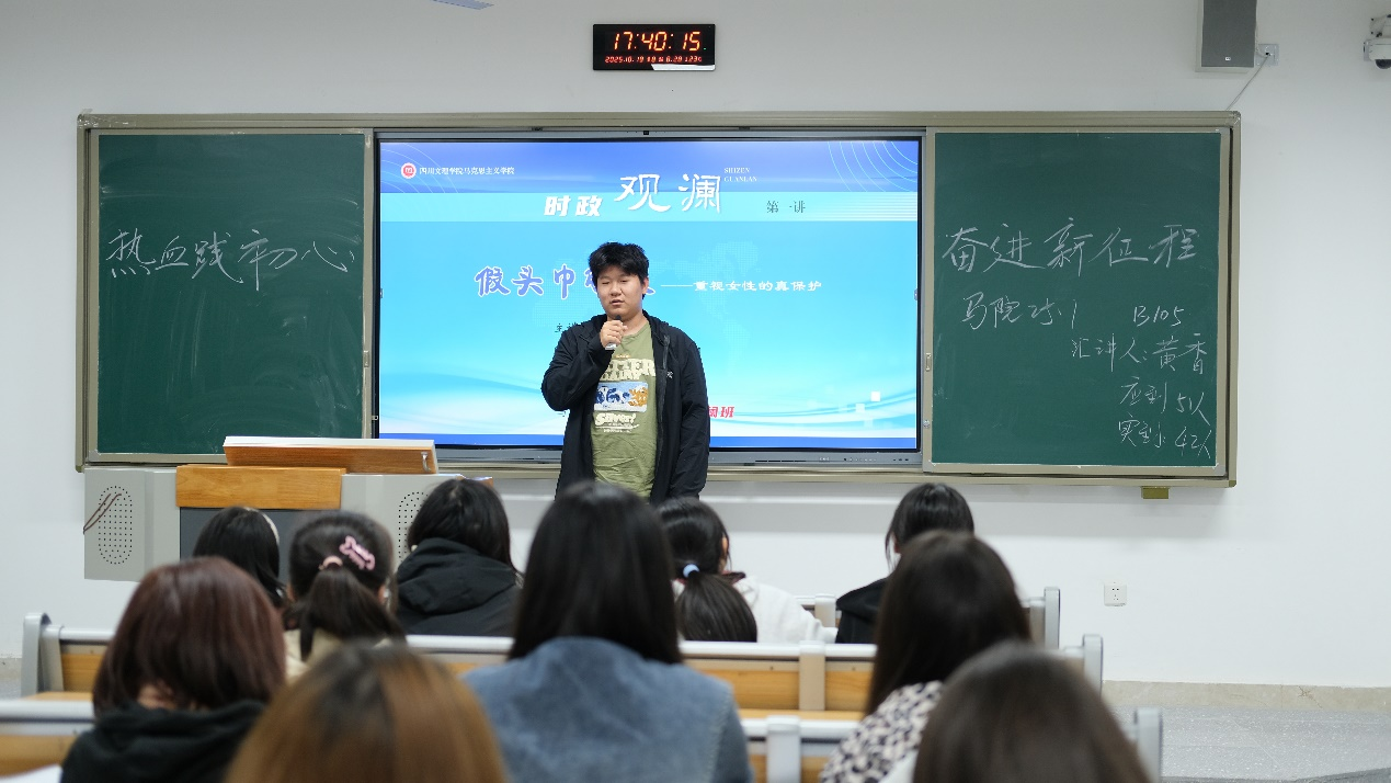 时政观澜,培育学术思维。班级在每周班会和团课中,常态化设置10分钟“时政观澜”小讲台,鼓励每位同学轮流上台,评析时事热点,培养关注现实、洞悉时政的意识。第一讲以“假头巾解放——重视女性的真保护”为题,引发了同学们对女性权益与社会思潮的热烈讨论,展现了马院学子接地气、有温度的社会观察力。