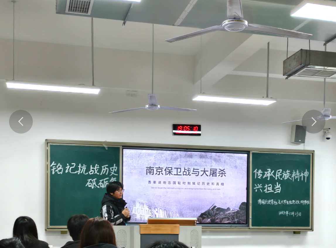 活动伊始,主持人围绕“铭记抗战历史·传承民族精神·砥砺复兴担当”核心主题进行开场,随后主讲人熊成以“南京保卫战与大屠杀”为核心,结合历史史料与影像资料,详细讲述了这段沉痛的历史,让团员青年深刻认识到战争的残酷与和平的珍贵。