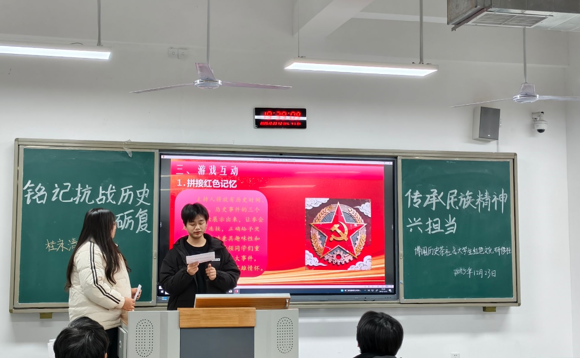 活动最后设置了互动体验环节。一是“拼接红色记忆”游戏,主持人拆分历史时间、事件关键信息,组织团员现场抢答;二是“唱响红歌”环节,选取《黄河大合唱》《国际歌》等经典红歌,调动团员的热情。趣味化的互动一改前面南京大屠杀主题演讲的沉重氛围,也调动了参与积极性,让大家重温红色历史、感悟民族精神。